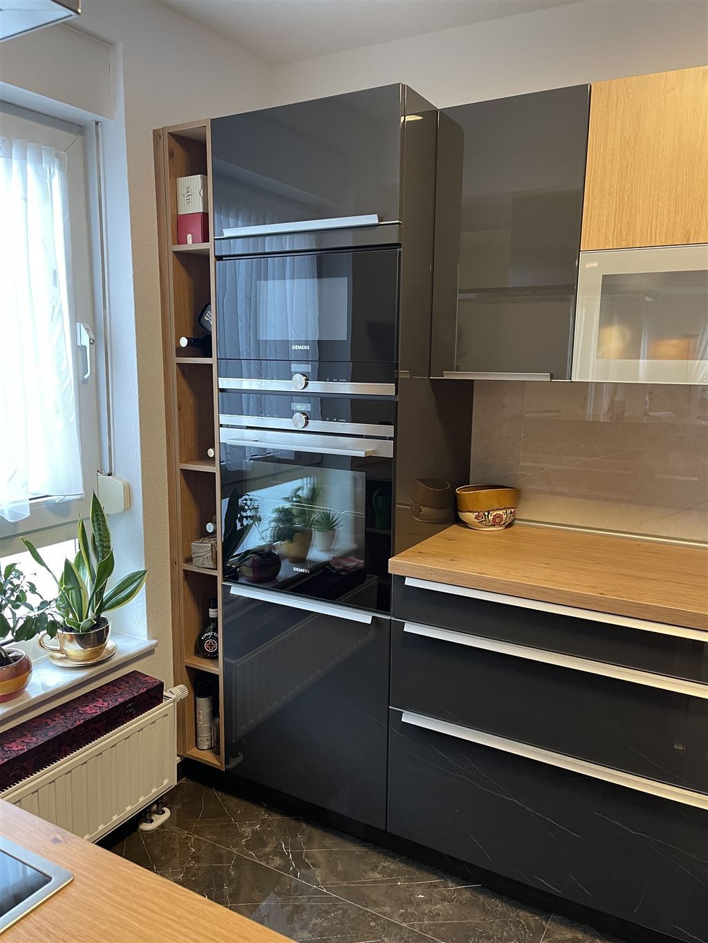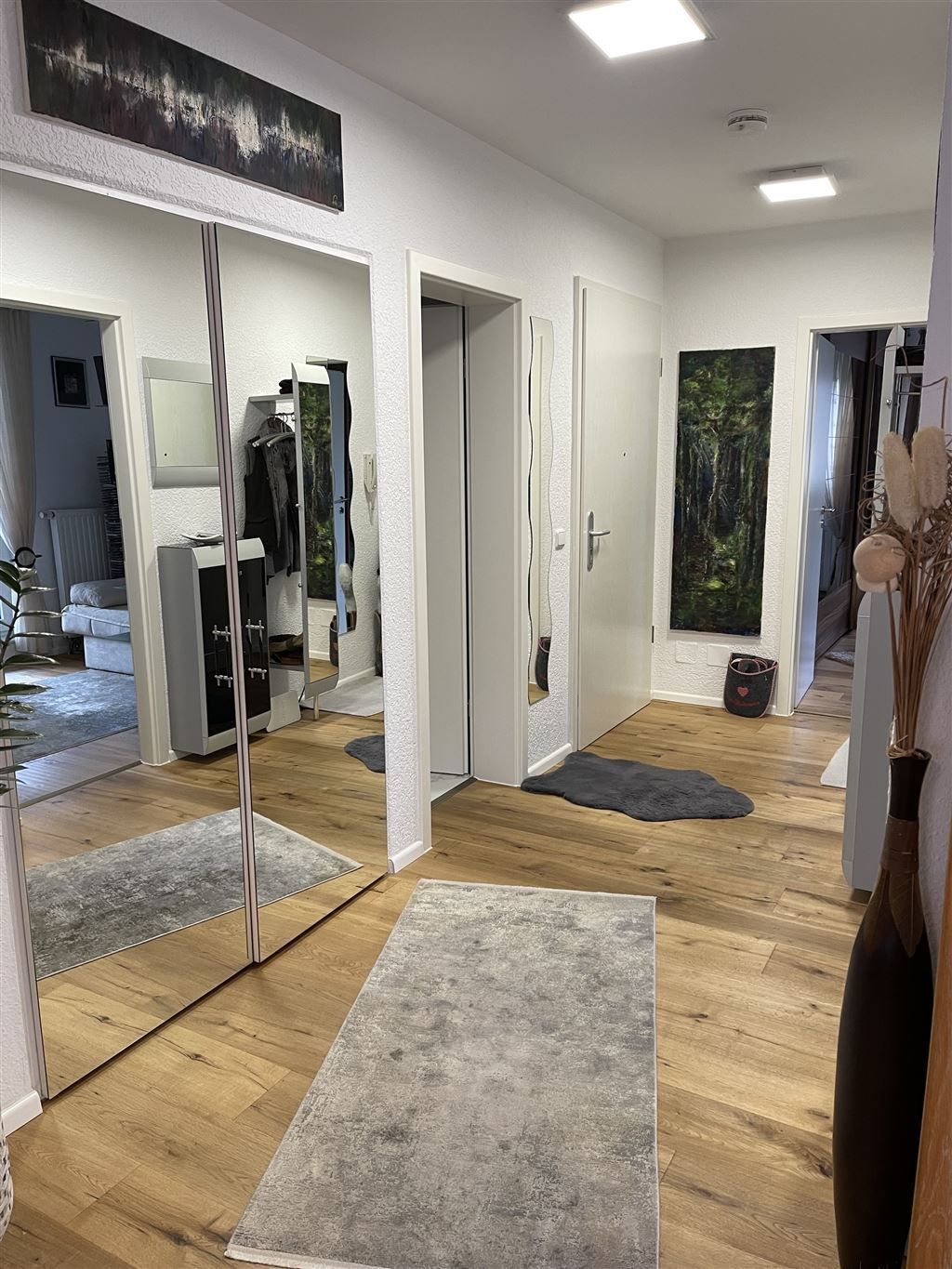 Die Böden sind mit Fliesen, Marmor und Parkett ausgestattet. Der Zugang zu einem Wasch-/Trockenraum sowie ein Kellerraum bieten zusätzlichen Stauraum und Funktionalität. Geheizt wird die Wohnung über eine Gas-Zentralheizung. Ein Stellplatz in der Tiefgarage ist vorhanden.